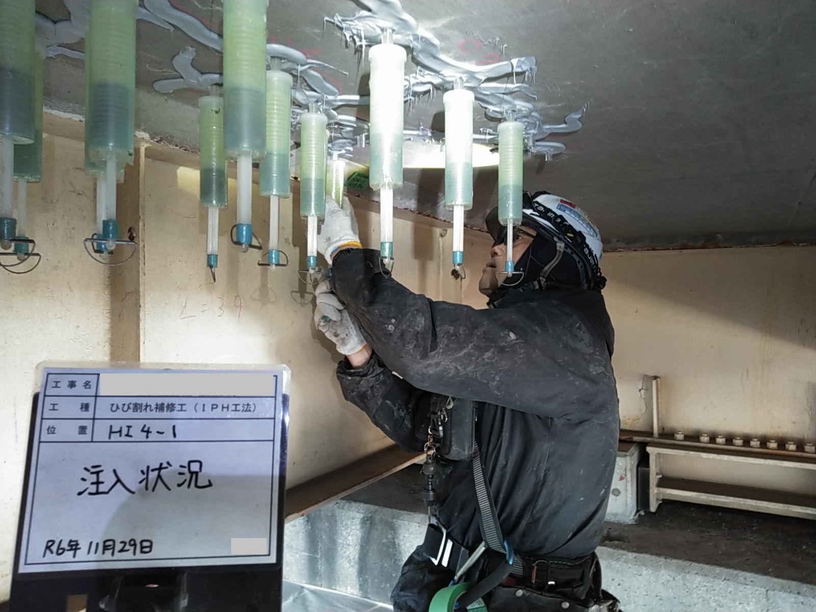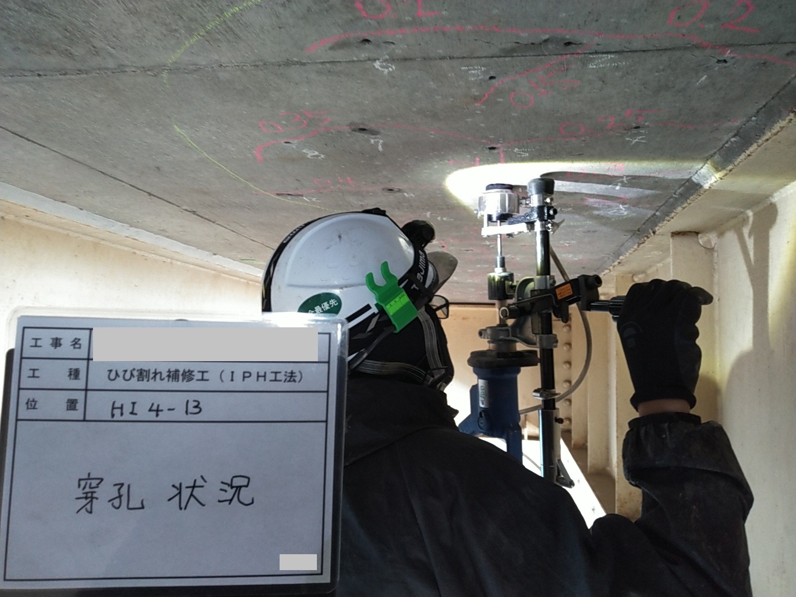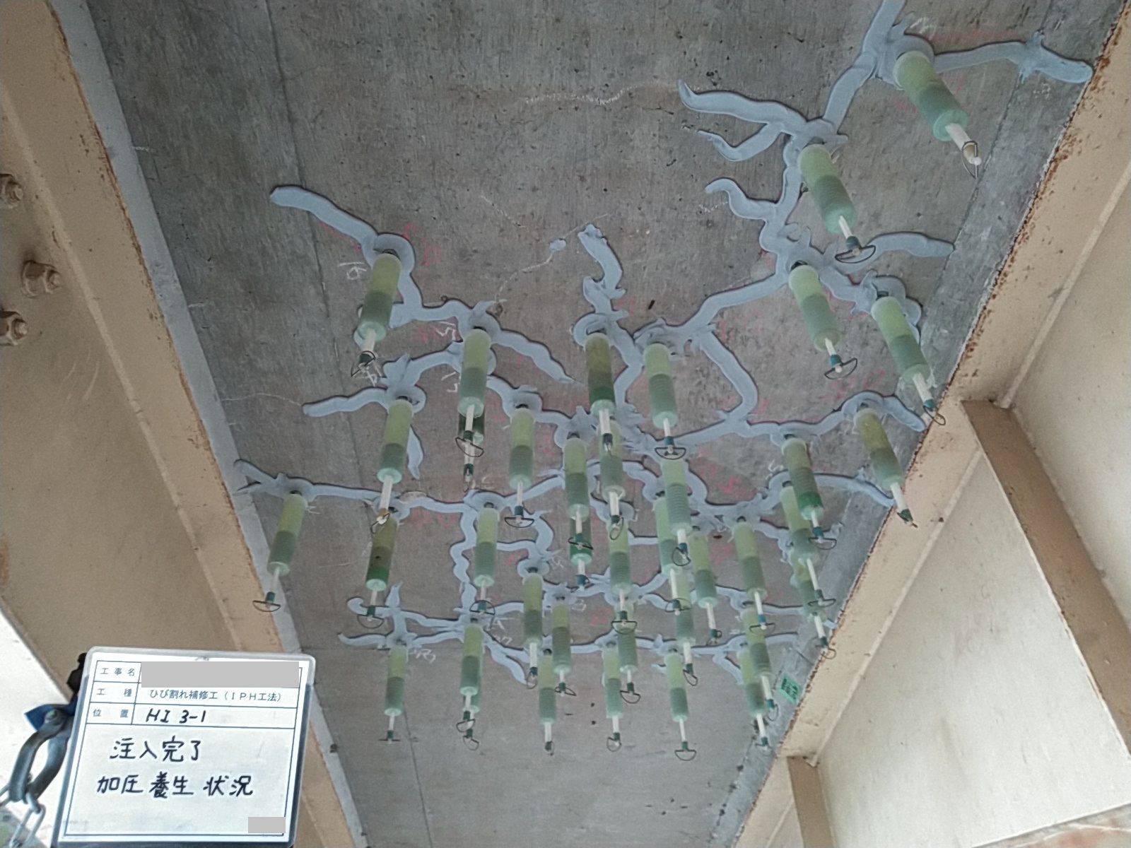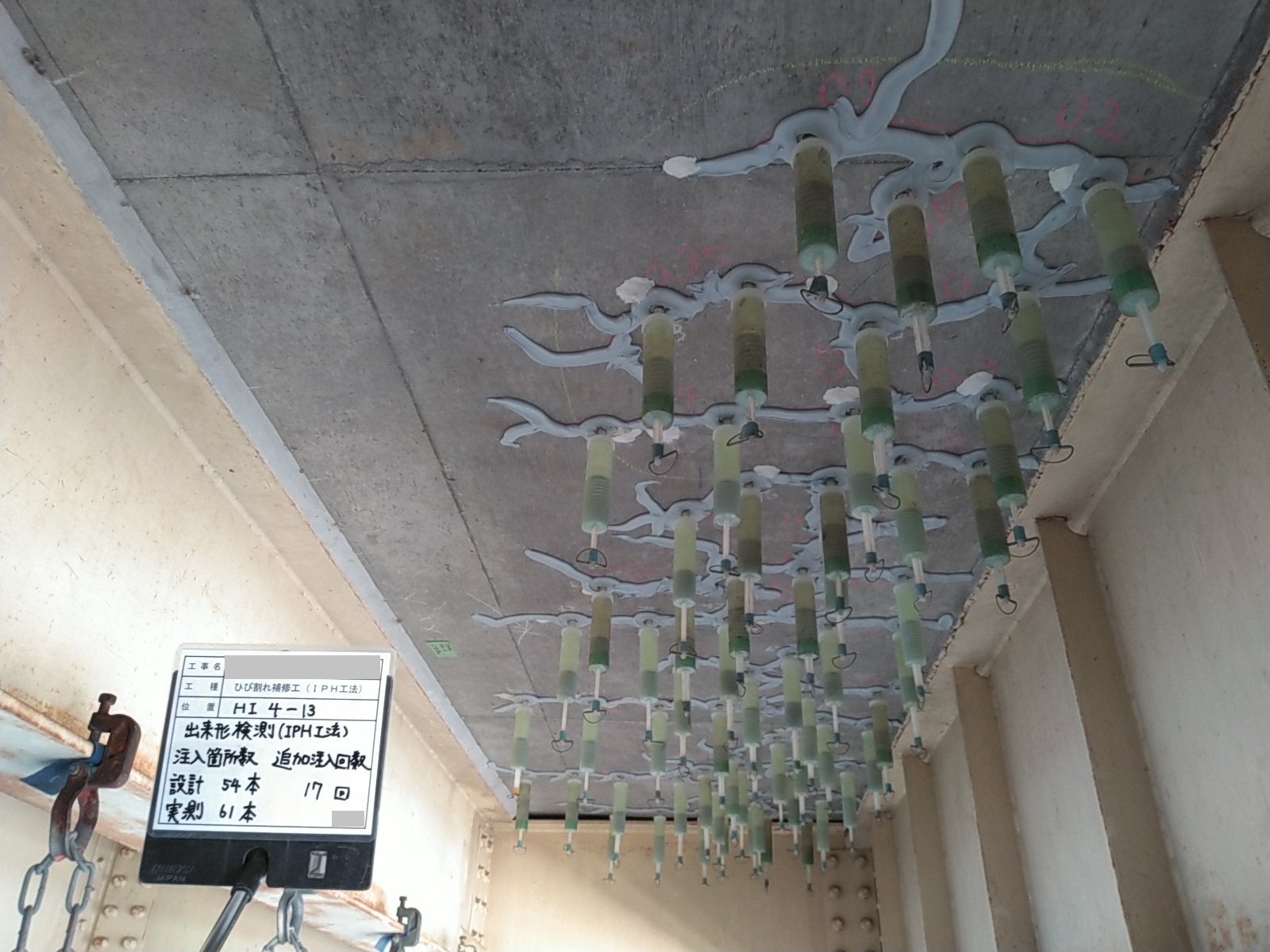 交通量の多い橋梁での下面ひび割れ補修でした。疲労により遊離石灰を含む格子状のひび割れや、内部水平ひび割れと考えられる浮き音が確認されたため、IPH工法による穿孔注入を行いました。