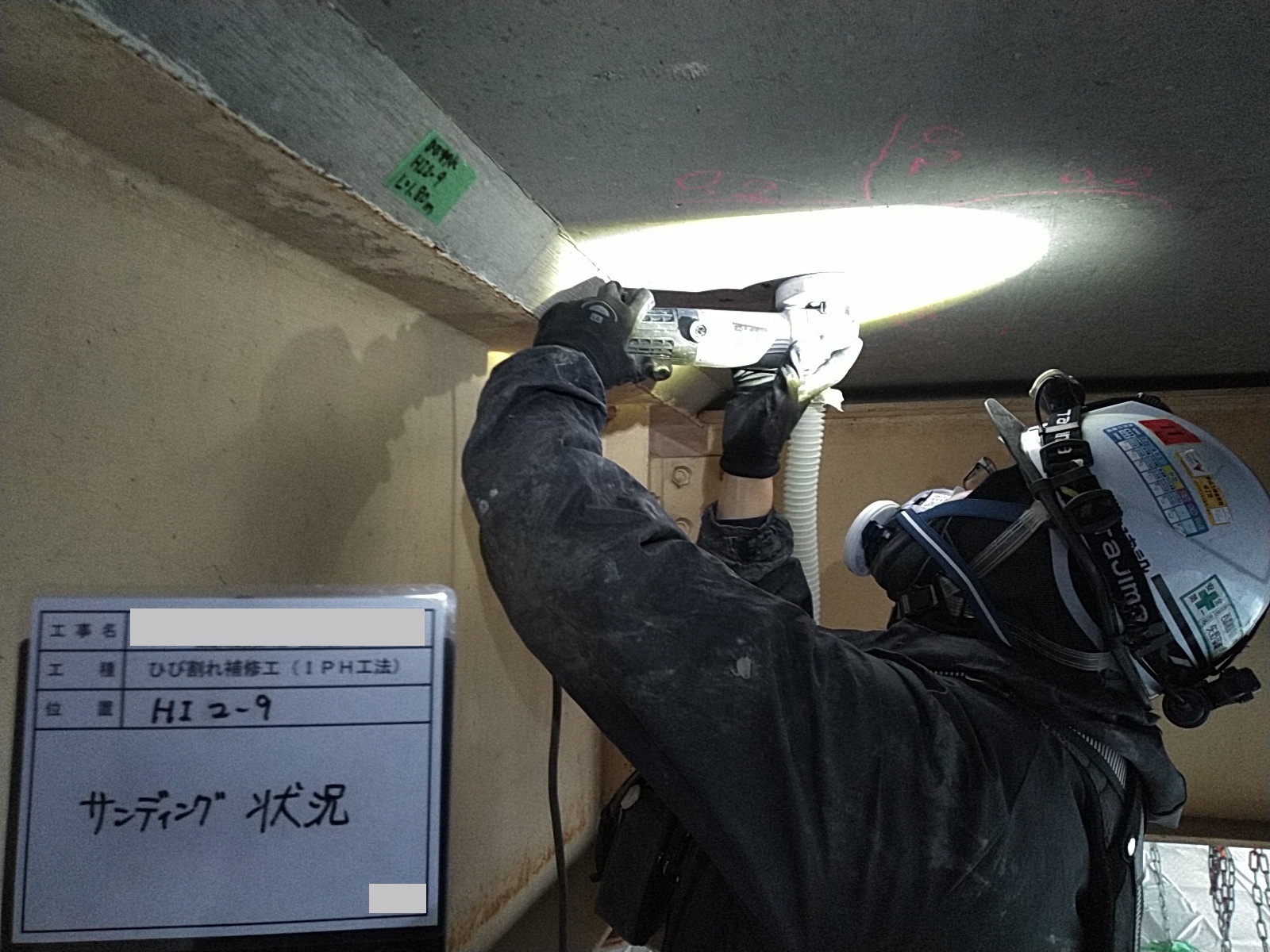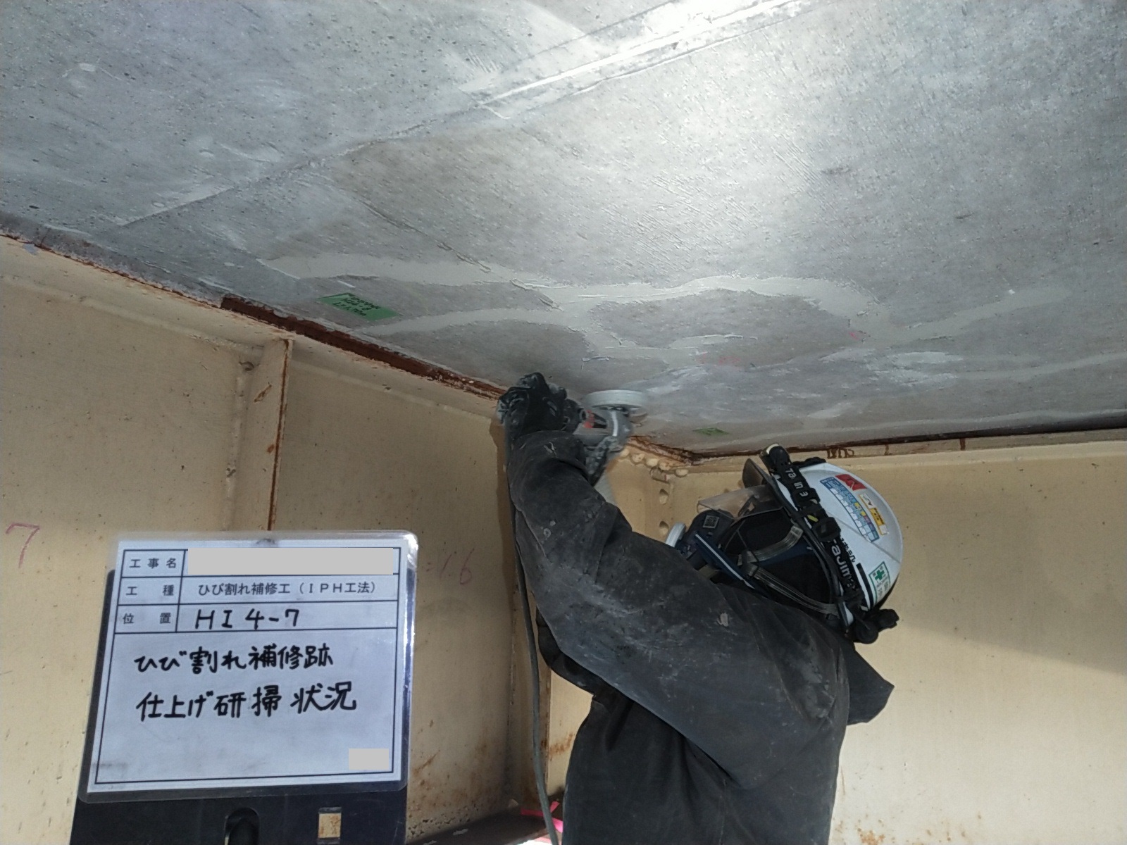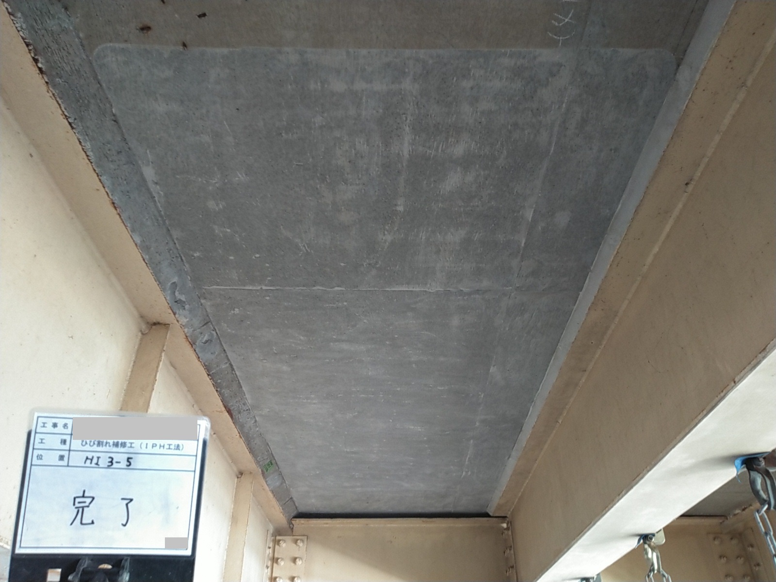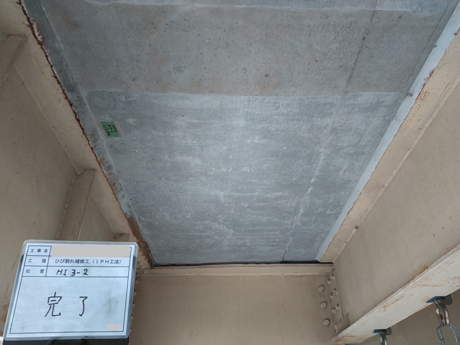 交通量の多い橋梁での下面ひび割れ補修でした。疲労により遊離石灰を含む格子状のひび割れや、内部水平ひび割れと考えられる浮き音が確認されたため、IPH工法による穿孔注入を行いました。